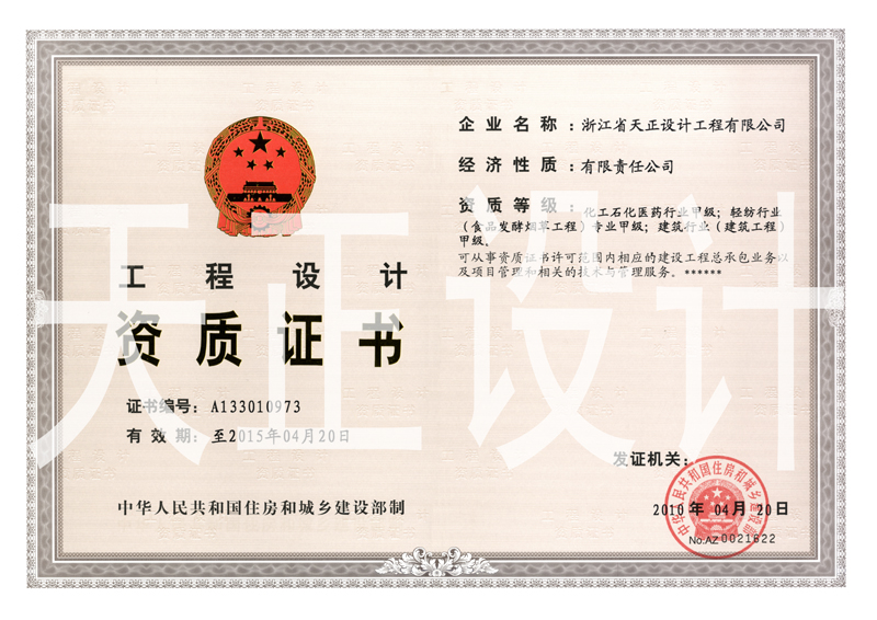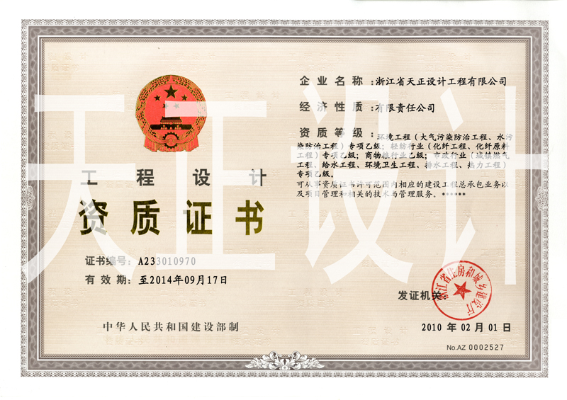 經省建設廳、國家建設部審查核準,我司順利通過工程勘察設計資質換證,保留了原有甲、乙級工程設計資質中的業務范圍。新的工程設計資質范圍為:化工石化醫藥行業甲級、輕紡行業(食品發酵煙草工程)專業甲級、建筑行業(建筑工程)甲級;環境工程(大氣污染防治工程、水污染防治工程)專項乙級、輕紡行業(化纖工程、化纖原料工程)專項乙級、商物糧行業乙級、市政行業(城鎮燃氣工程、給水工程、環境衛生工程、排水工程、熱力工程)專項乙級。可從事資質證書許可范圍內相應的建設工程總承包業務以及項目管理和相關的技術與管理服務。