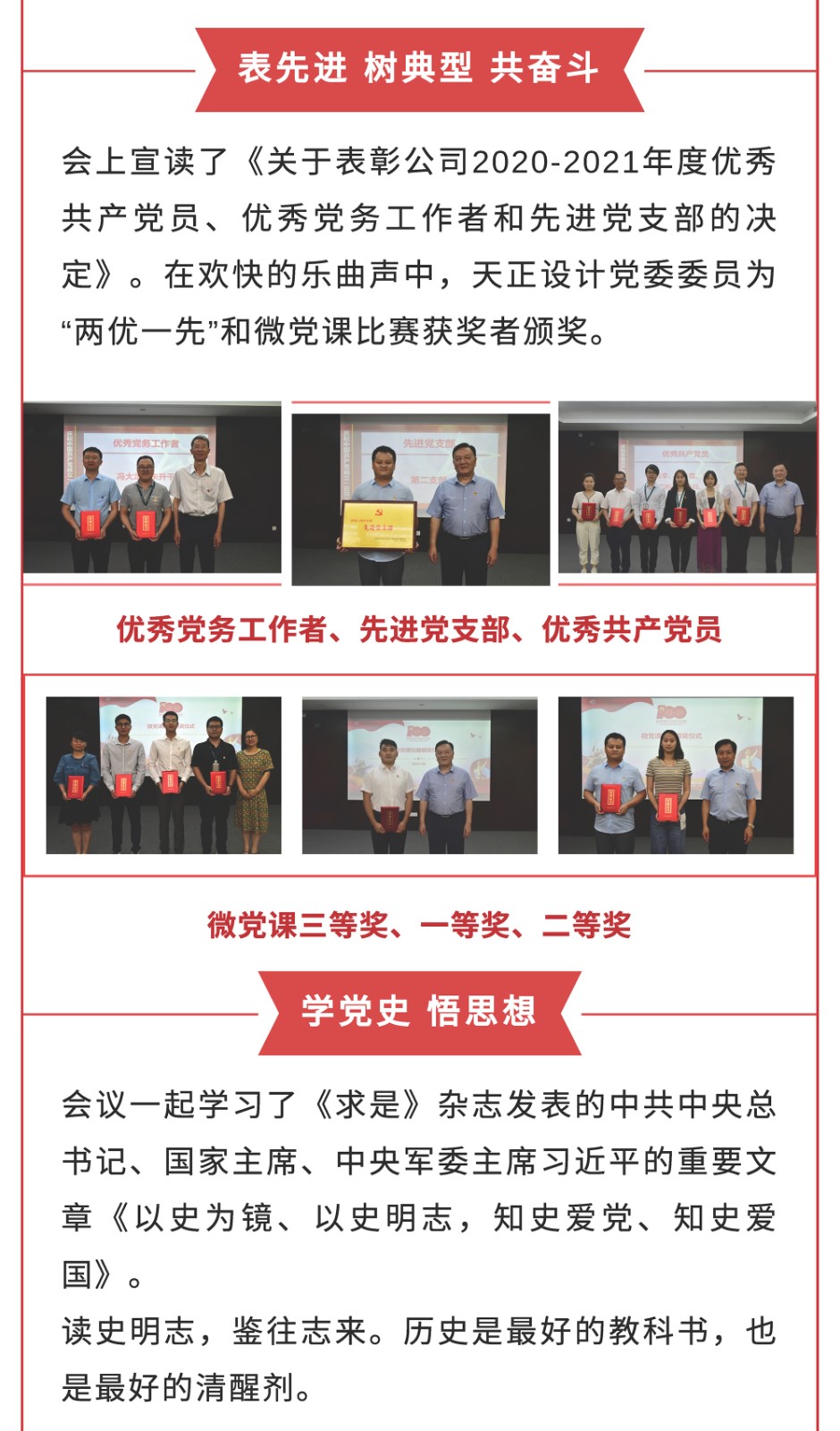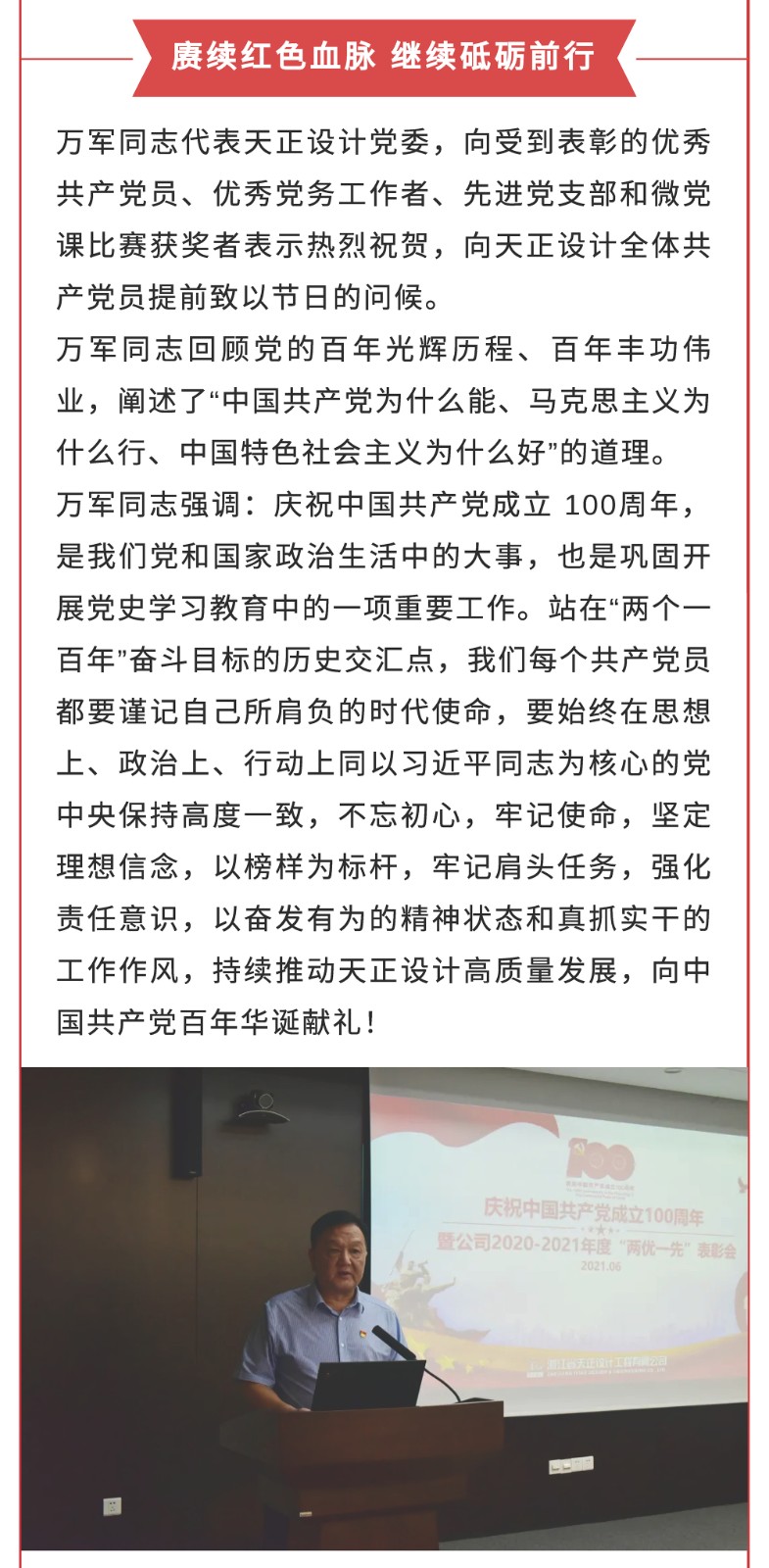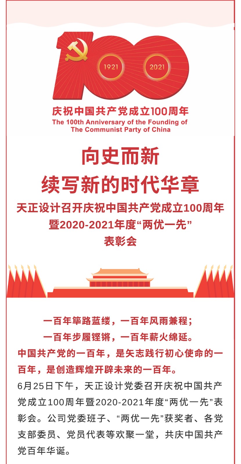 向史而新,續寫新的時代華章——天正設計召開慶祝中國共產黨成立100周年暨2020-2021年度“兩優一先”表彰會